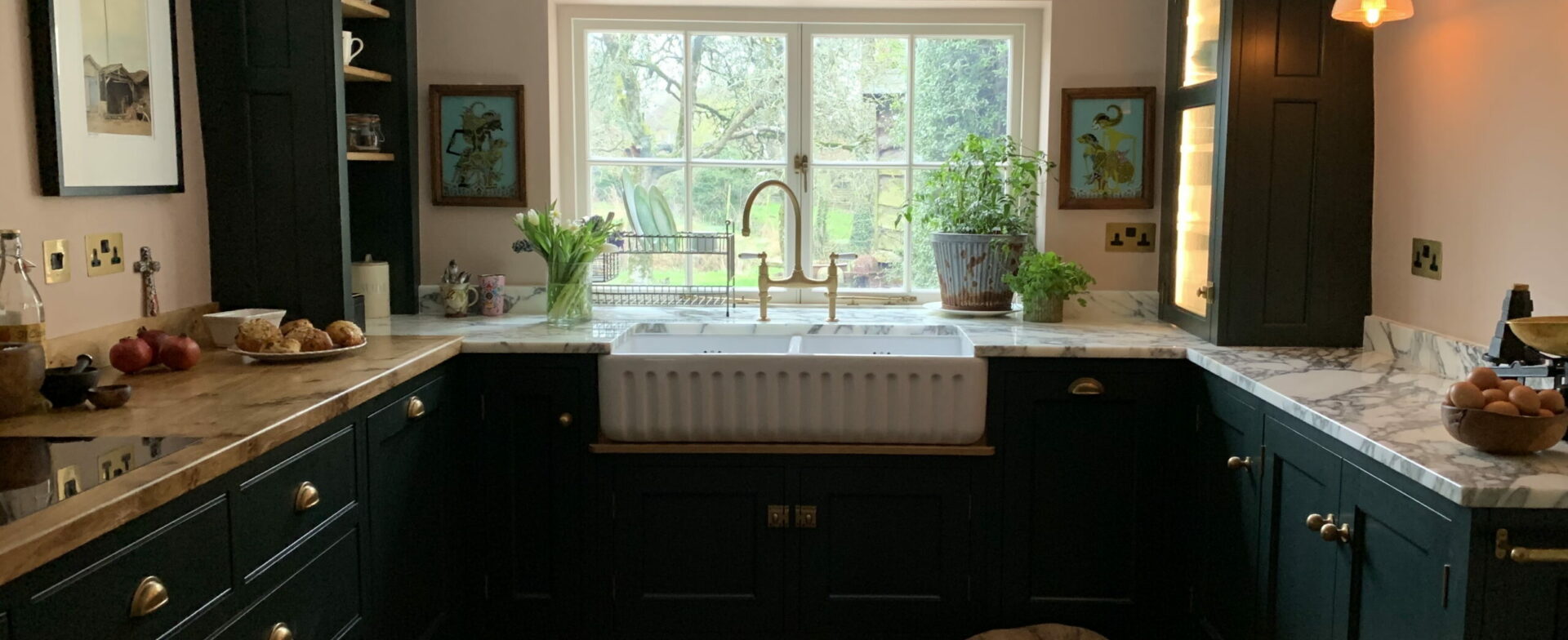 In this kitchen the layout was very much dictated by the shape of the room, a U-shape. However with plans in place to open up the end wall with a large window, this allowed for a feature sink area. One befitting such a period property, creating the necessary focal point, and offering anyone washing dishes glorious views across the lawn to the river. Full domestic karma!