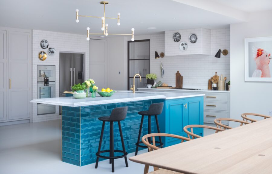 This contemporary extension was added to a listed Georgian house. It seemed sensible to mirror this traditional-meets-modern approach with the design of the kitchen. We created a cabinetry design with a square edged traditional bollection mould (a mould which rises above the face of the frame). The Buster and Punch brass handles, the tiled island and the striking Little Greene Paint Company Marine Blue colour give the space a sliver of the contemporary without being too sharp and oppressive.